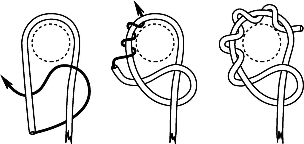 - Взять ходовой конец, пропустить его через петлю, делая это снизу вверх.