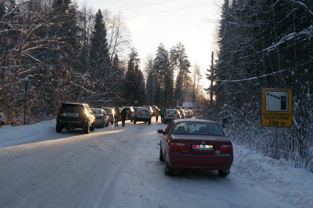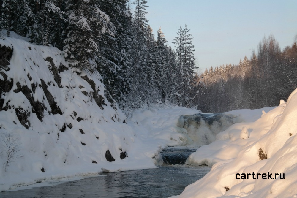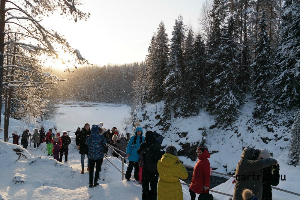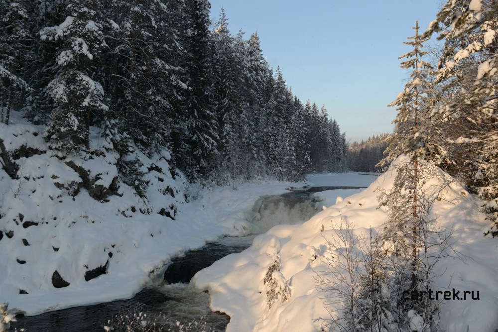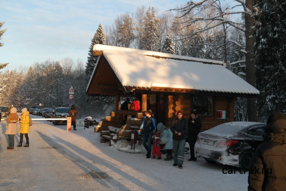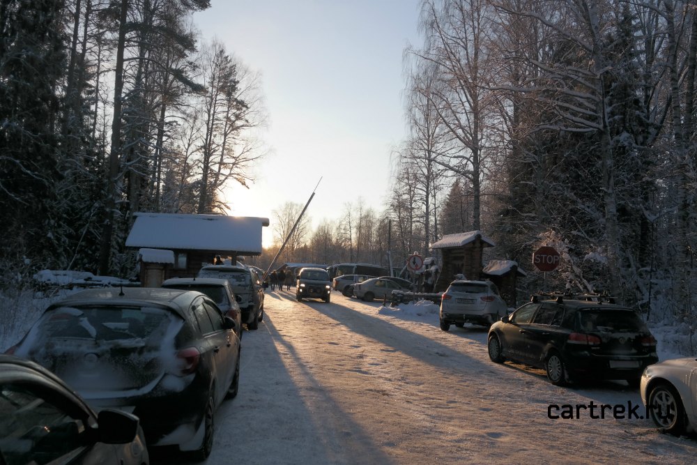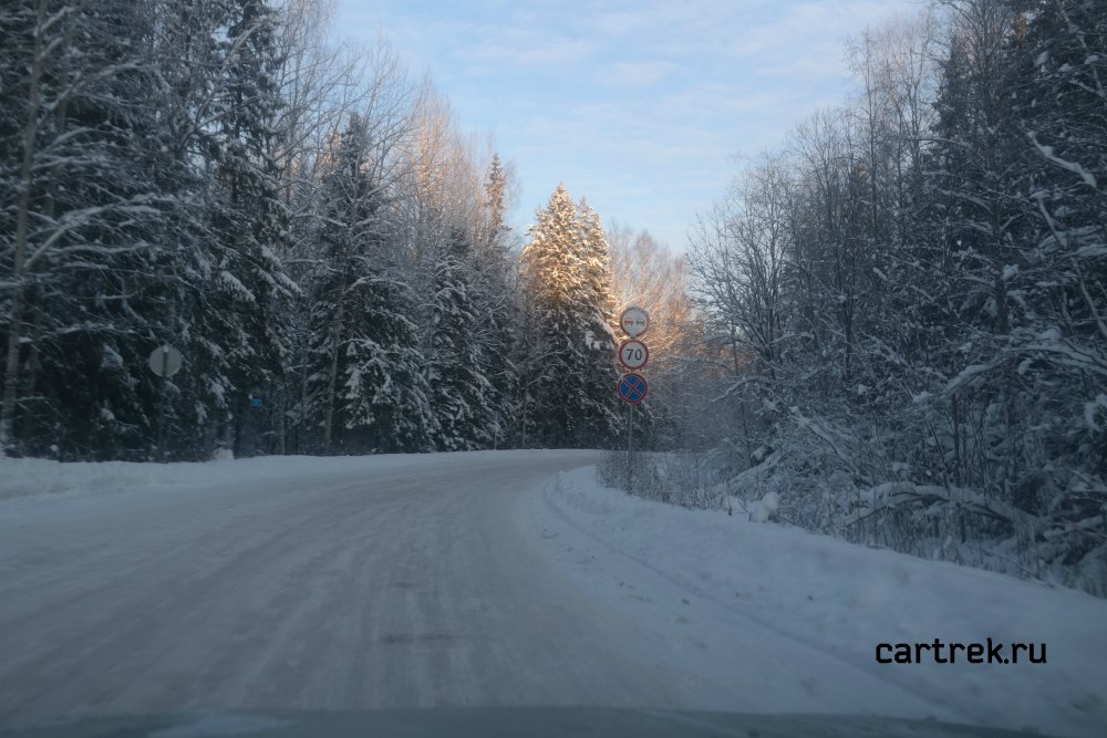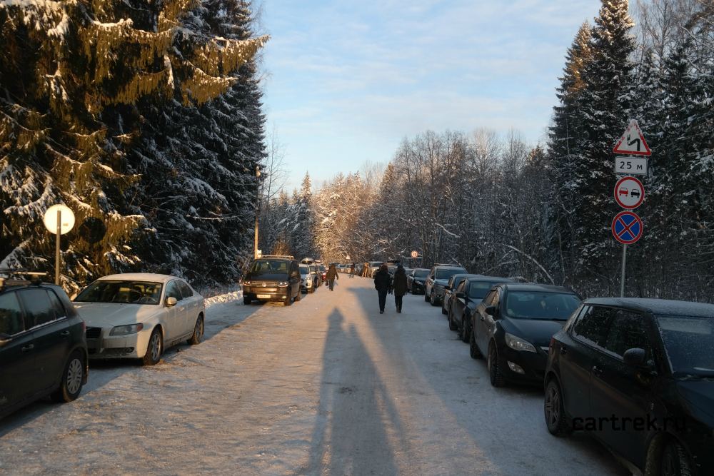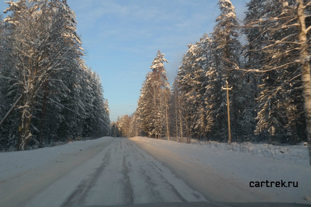 Как я писал выше, хотелось совершить одним днем поездку на машине из Санкт-Петербурга и погулять на природе. Полазив по интернету, определил интересные для себя места, находящиеся рядом с Петрозаводском: — карельская деревня Кинерма; — вотчина карельского Деда Мороза Талви Укко; — водопад Кивач. Так как времени на прогулку было немного, то нужно было выбрать только одно место для посещения. Прочитав несколько негативных отзывов о вотчине карельского Деда Мороза, понял, что туда не поеду. Заинтересовала деревня Кинерма, но, по моему мнению, туда надо ехать с ночевкой. По итогам выбор пал на водопад. Смущало только, что в основном отзывы о нем были про летнее посещение, а вот как водопад Кивач выглядит зимой и стоит ли туда ехать в это время года, информации было мало. Итак, выехав из Санкт-Петербурга в 6 утра, в 13 я проехал поворот на Петрозаводск, в два часа дня я свернул с трассы на небольшую дорогу, ведущую к водопаду.