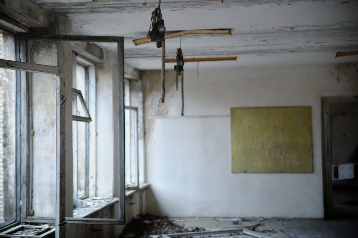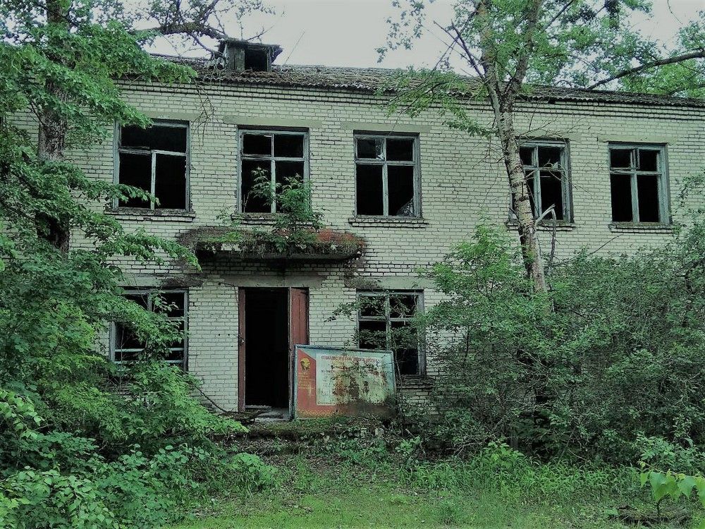 Деревня Оревичи. Дозиметр показывает 112 микрорентген, что говорит о том, что эта территория подверглась сильному радиоактивному загрязнению. Местная школа – настоящая находка для тех, кому по душе эстетика брошенных радиоактивных пространств. В классах и коридорах школы лежат противогазы, старые пожелтевшие учебники и плакаты с пионерской тематикой. Стены кабинетов покрыты мхом – сырость постепенно съедает здание.