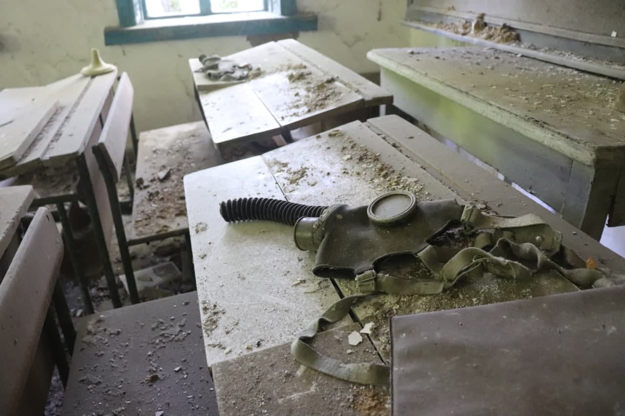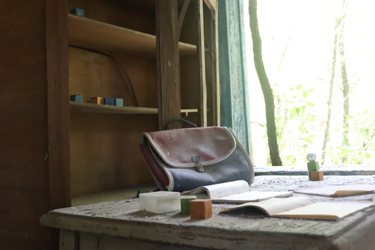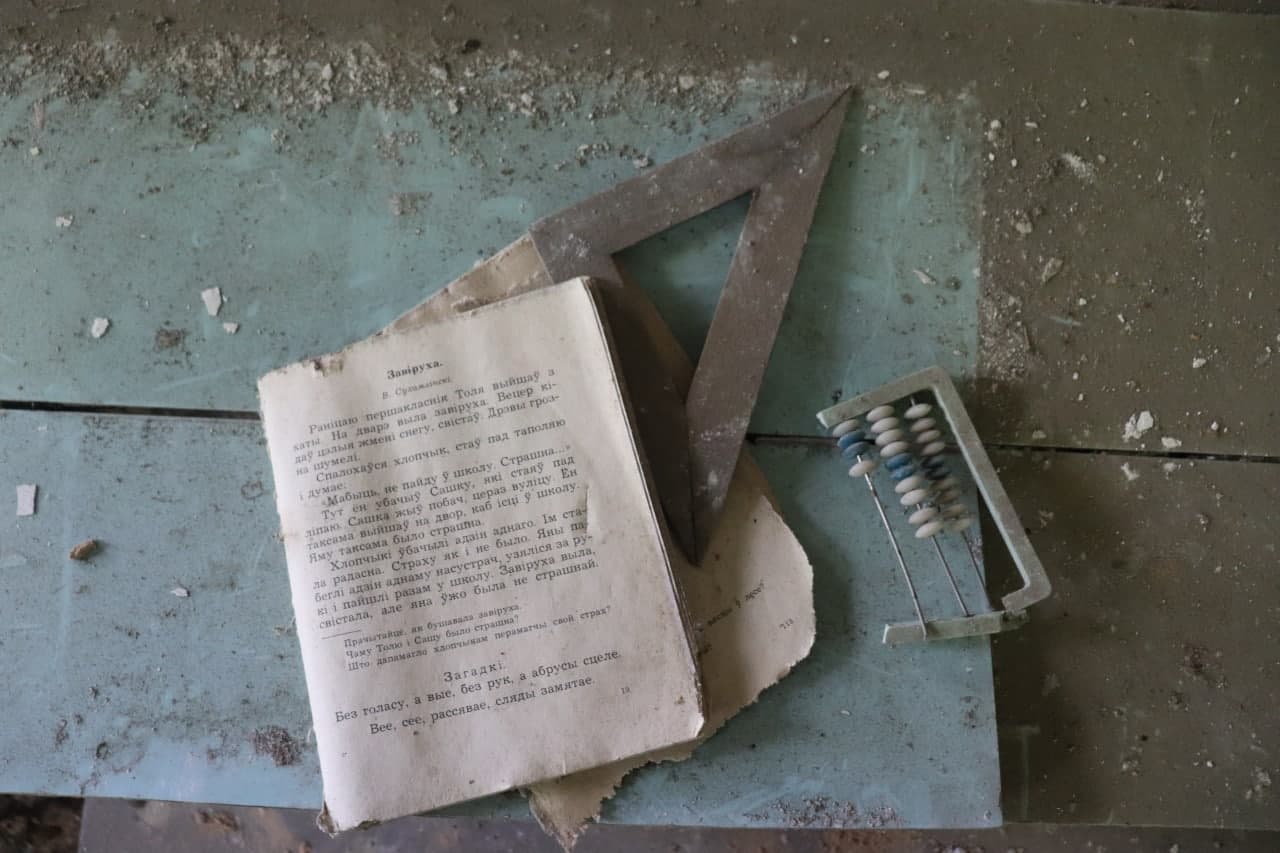 Там было очень много парт, а на некоторых лежали старые и уже рассыпающиеся противогазы. Стоял детский портфель, были разбросаны кубики, и даже был башмачок от куклы. А еще я заметила, что там были учебники и тетрадки на белорусском языке. Возле этой школы стоял старый ржавеющий мотоцикл.
