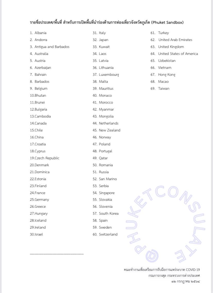 22 сентября 2021 г. МИД Таиланда внес еще 8 стран в список государств, откуда можно въезжать на Пхукет и Самуи в рамках проектов «Песочница» и «Самуи плюс» без карантина. По сообщению Генконсульства РФ в Пхукете, в него добавились Казахстан, Киргизия, Индия, Иордания, Мальдивы, Оман, Перу и Саудовская Аравия.