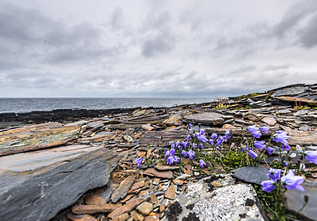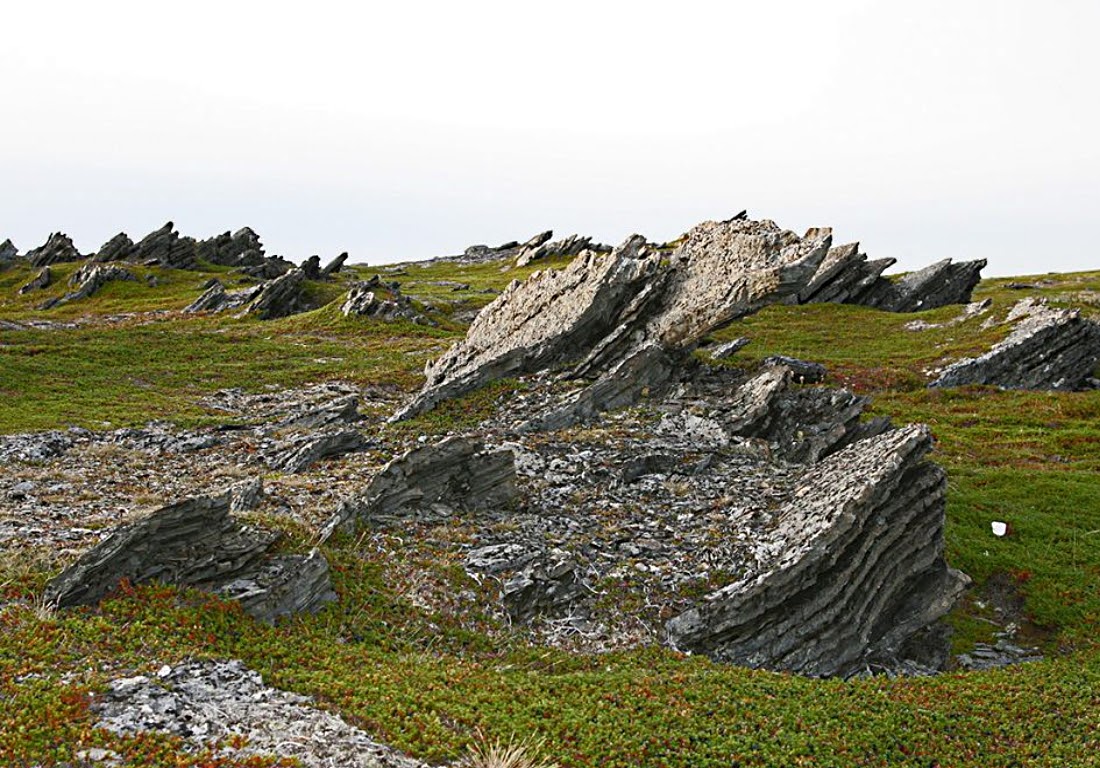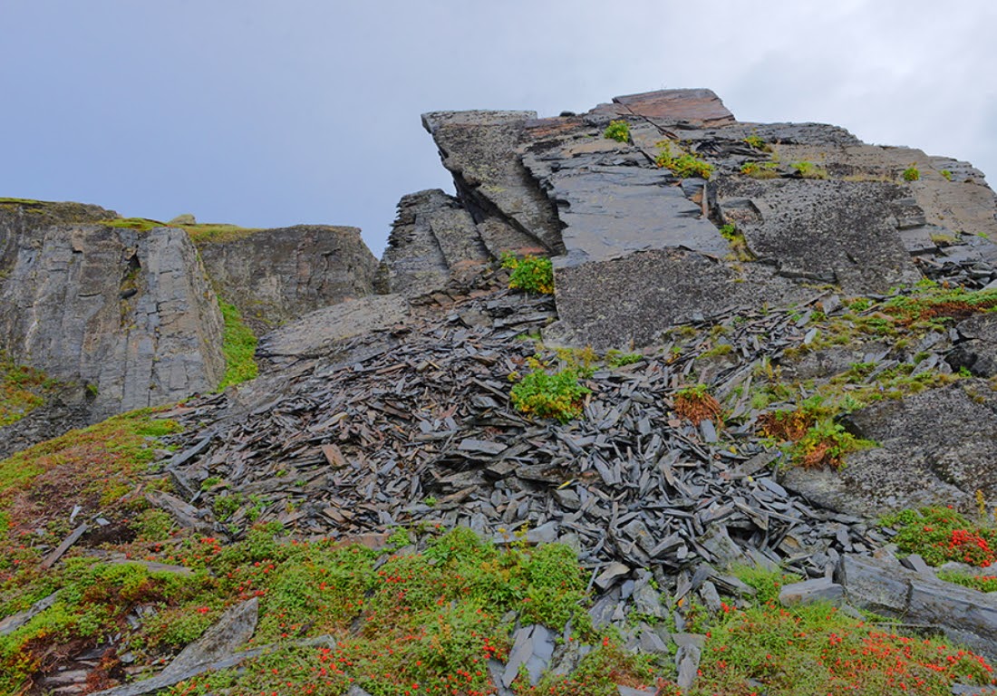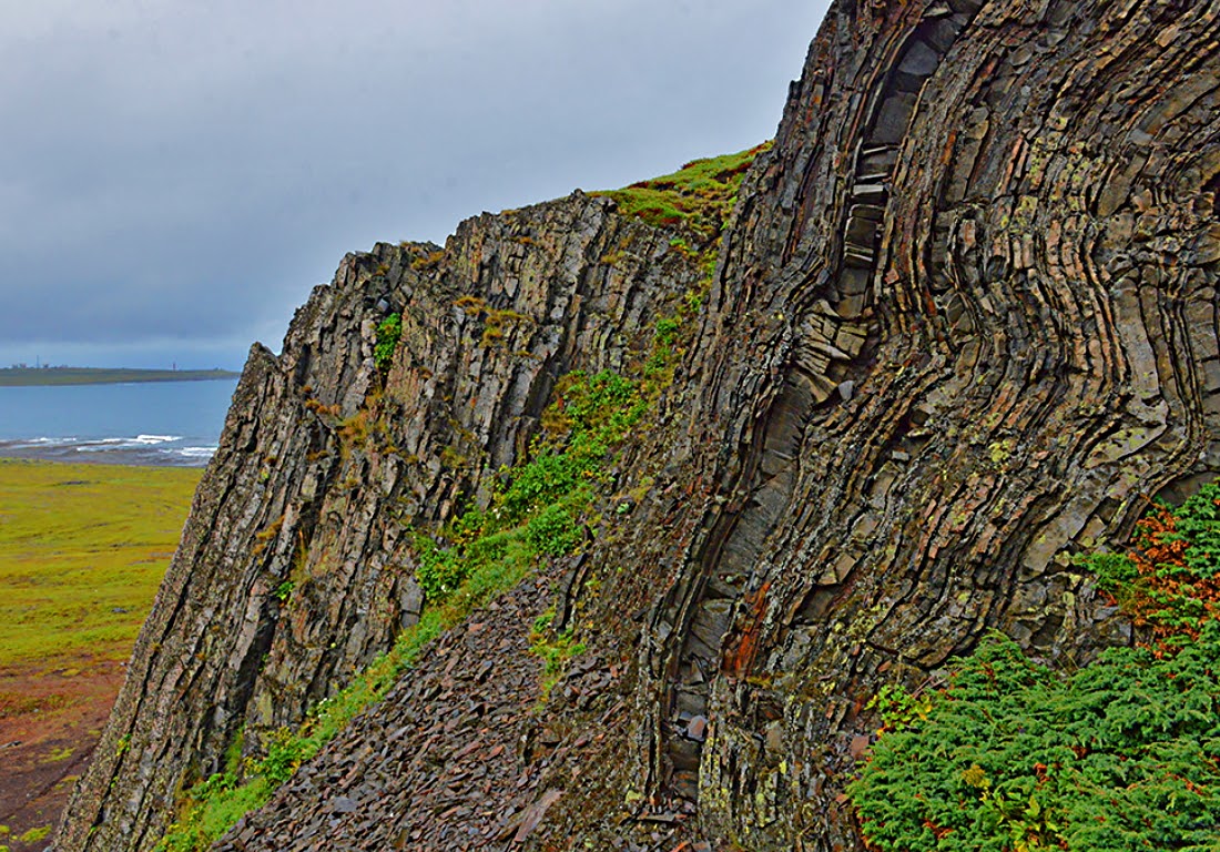 Другое дело берег — он похож на гигантскую терку черного цвета. Ледники превратили сланец в слоистое нечто с очень острыми гранями, которые расположены вертикально. Во время отлива обнажаются горы ярких оранжево-горчичных водорослей. Ходить здесь небезопасно — скользко.