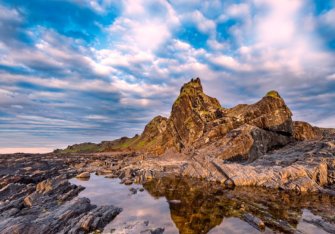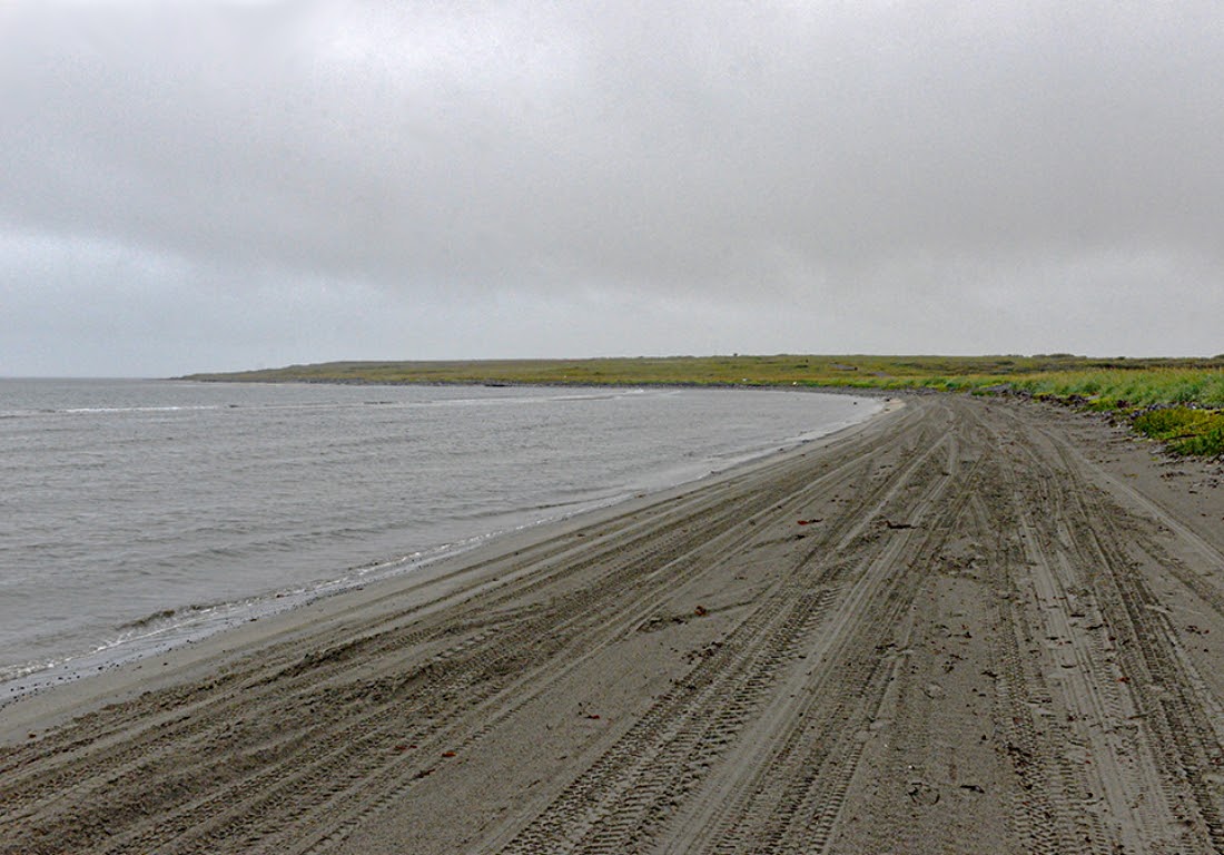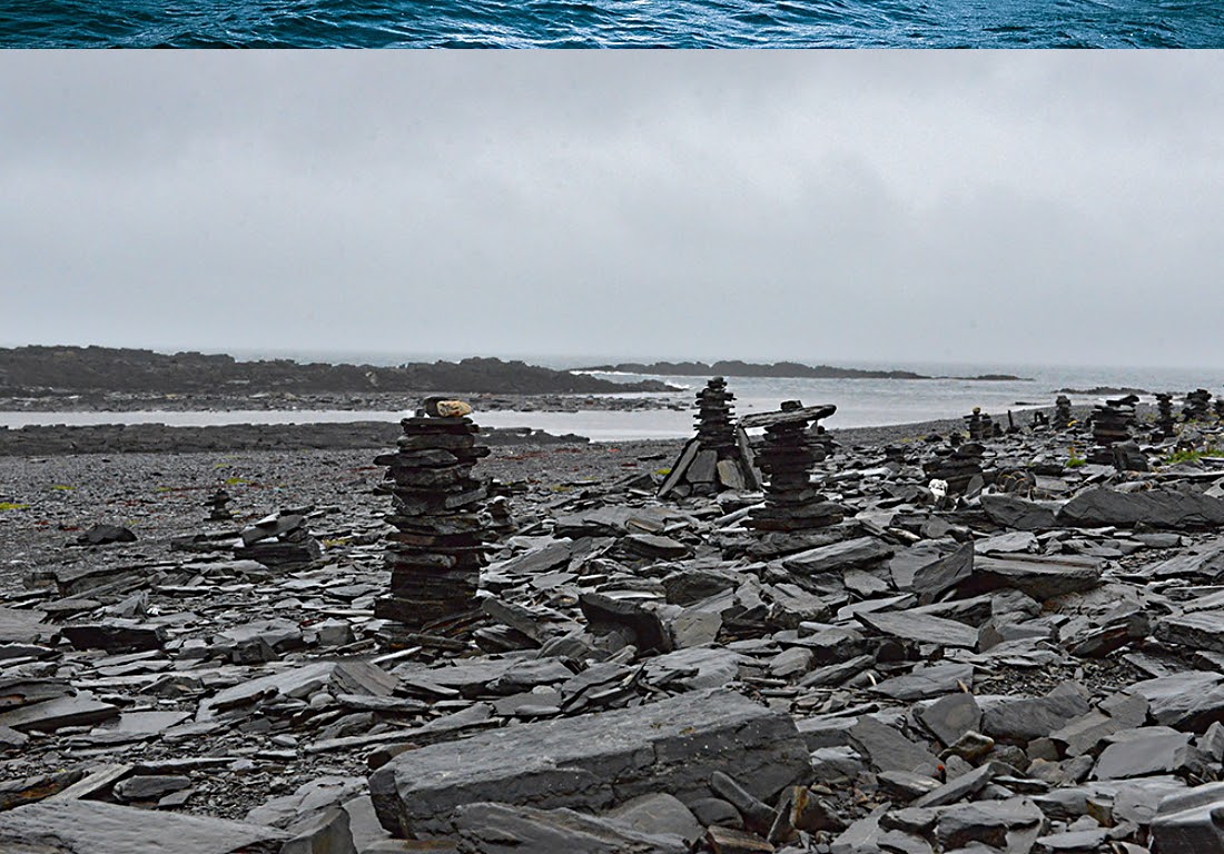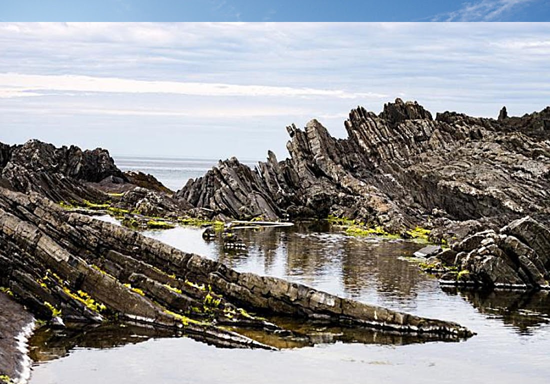 Другое дело берег — он похож на гигантскую терку черного цвета. Ледники превратили сланец в слоистое нечто с очень острыми гранями, которые расположены вертикально. Во время отлива обнажаются горы ярких оранжево-горчичных водорослей. Ходить здесь небезопасно — скользко.