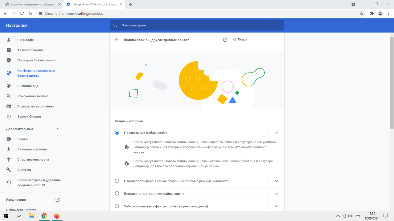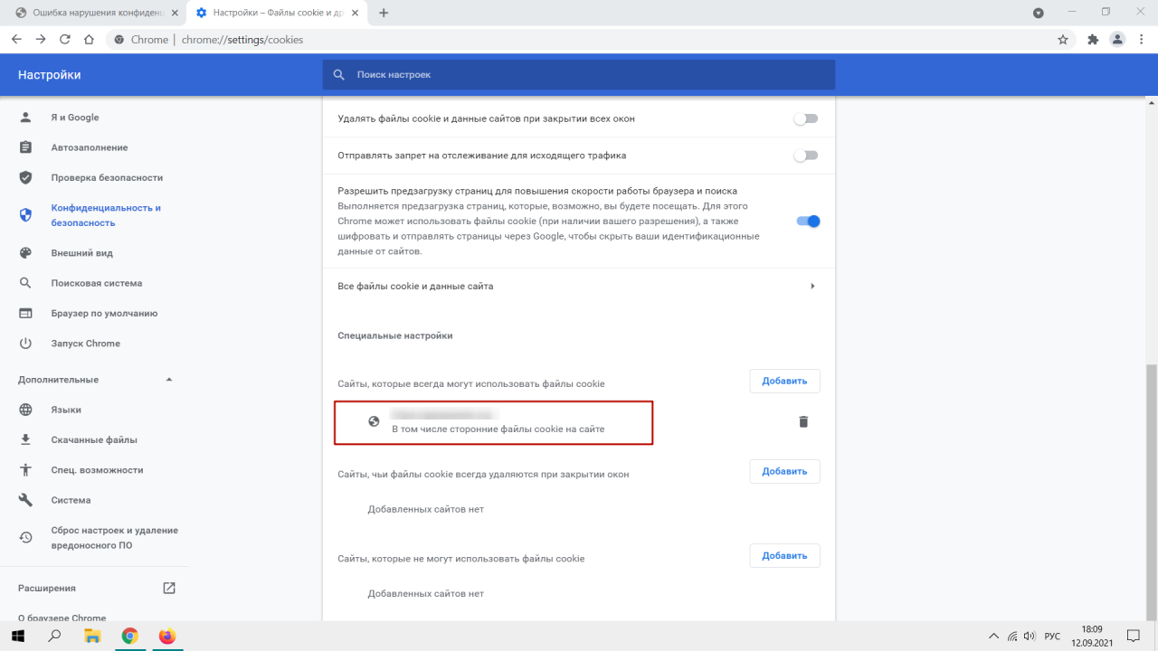 - Файлы cookie. Блокировка этого элемента запрещает сайту собирать информацию о пользователе, такую как посещаемые веб-страницы, логины и пароли. Некоторые ресурсы могут неправильно работать без разрешения на обработку этих данных.