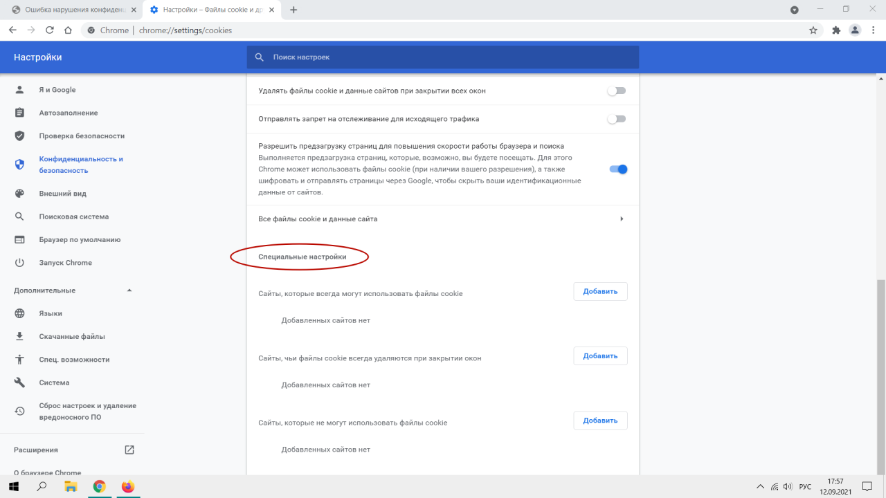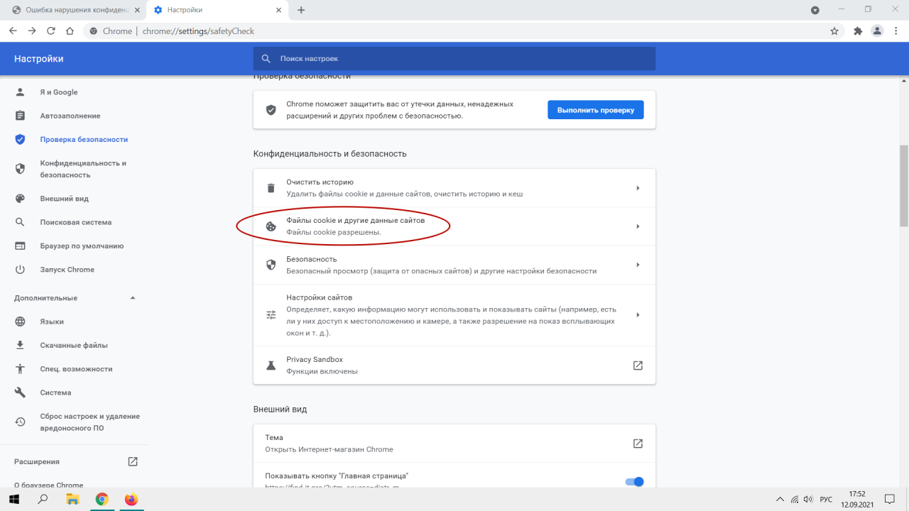А затем кликаем по надписи «Файлы cookie и другие данные сайтов».