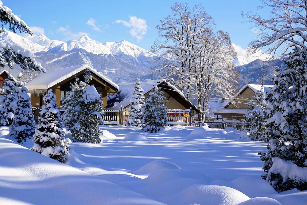 Сочи (Красная поляна). Отдых зимой в горах может сочетать в себе проживание у моря и катание в горах. Именно этим могут похвастаться в Сочи. Сам горнолыжный курорт называется Красная поляна и состоит из 5 оригинальных курортов: самой Красной поляны, Эсто-Садка с Горки Градом, Газпрома и Розы хутора, расстояние между ними 5-10 км. Черное море смягчает климат, а высокая влажность способствует снегопадам. Средняя температура зимой около нуля. Протяженность трасс 146 км, перепад высот от 975 до 2509 метров.