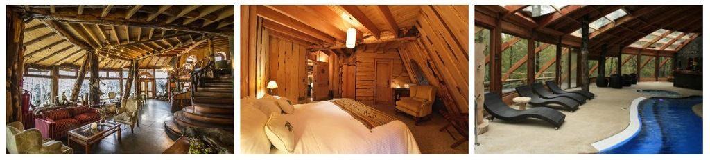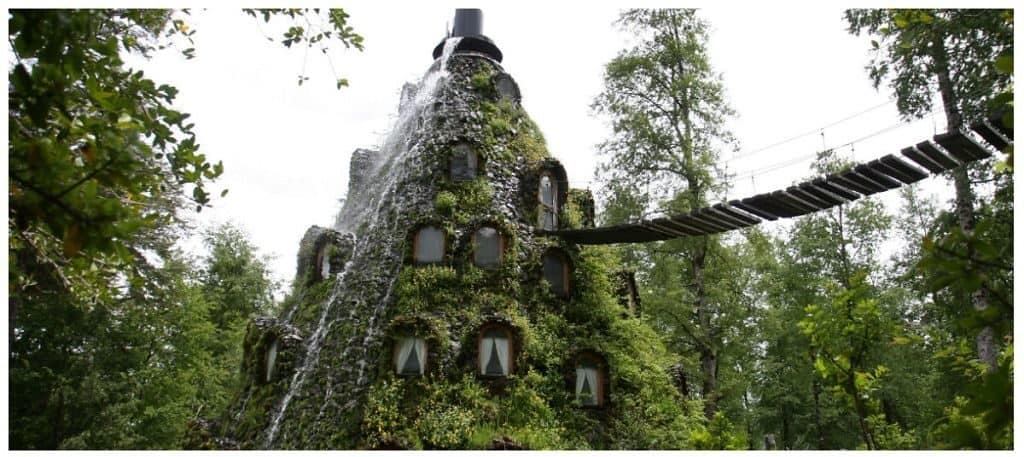 Этот чудо-отель, спрятанный в центре частного природного заповедника. Он построен в форме вулкана из дерева и камня. Сооружение покрыто пышной растительностью, среди которой проглядываются окошки, поросшие мхом. «Вулкан» периодически извергается, только не лавой, а водой из местных источников.