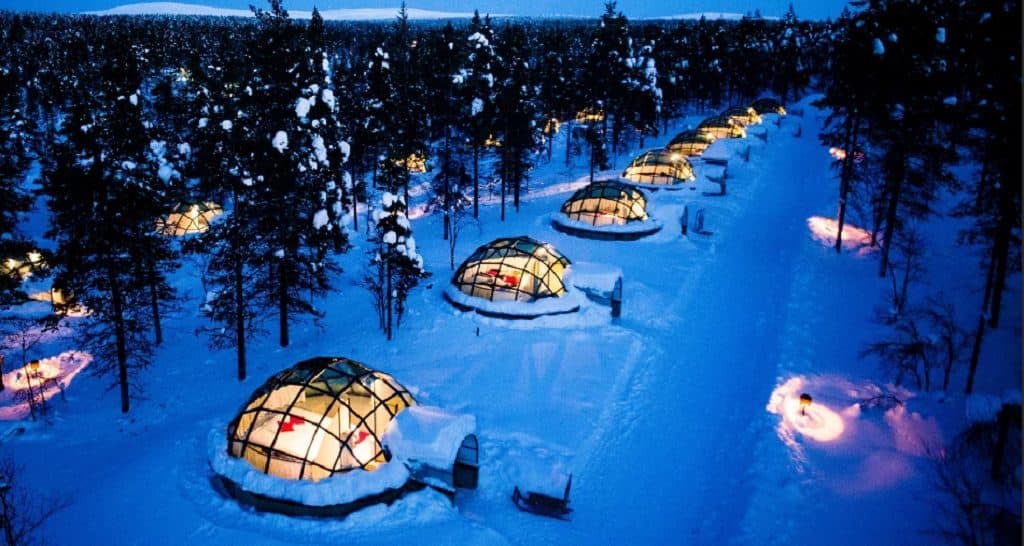 Kakslauttanen Arctic Resort – один из самых знаменитых арктических курортов премиум-класса, расположенный в 240 км к северу от Полярного круга в финской Лапландии. В этом необычном отеле посетители могут пожить в иглу со стеклянной крышей, через которую можно наблюдать за северным сиянием, лежа в своей постели. «Световое шоу», которое можно увидеть в этой арктической среде, не имеет себе равных.