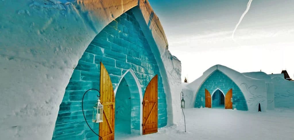 «De Glase Ice» в Квебеке открывает свои ледяные двери для посетителей со всего мира с января по март. Для этого его ежегодно перестраивают, используя при этом около 500 т льда и 15 000 т снега. Для создания ледяного дворца устанавливают металлический каркас, на который впоследствии уже крепится снежная масса. Опытные скульпторы создают массивную структуру в течение 6 недель, и их работа действительно поражает! Потолки ледяного дворца достигают 6 м, а стены имеют толщину 1 м.