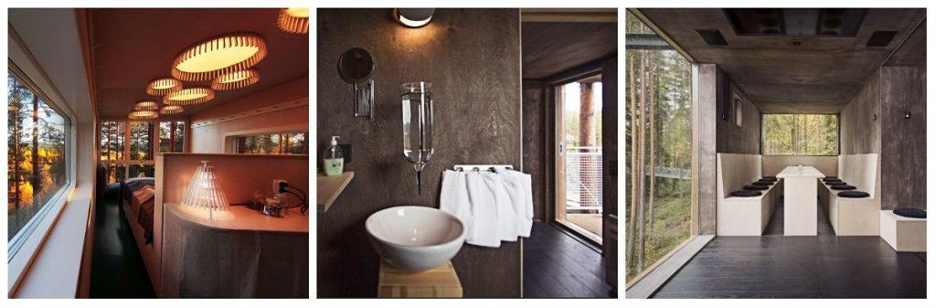 В заведении TreeHotel ведущие шведские архитекторы использовали идею домика на дереве и придали ей странный футуристический облик. При этом создатели старались по минимуму воздействовать на окружающую среду. В TreeHotel есть домик в форме ящика, летающей тарелки и огромного птичьего гнезда. Но одним из самых невероятных является номер в виде огромного зеркального куба, который отлично сочетается с природой. Благодаря зеркальной стороне структура кажется почти невидимой, поскольку отражает естественную красоту вокруг нее.