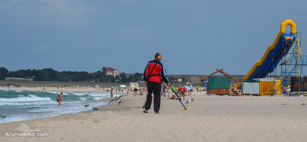 И незаменимый мужик с металлодетектором. У этого, похоже, желтые наушники позволяют на звук отличать все элементы таблицы Менделеева, которые подпадают под излучающую катушку.