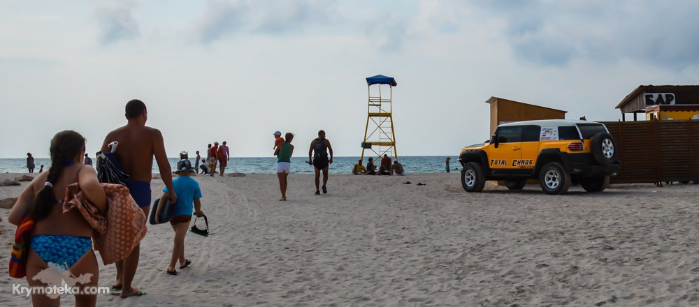 Отели в Оленевке у самого моря не стоят – мешают грязевые лиманы, так что к бережку придется прогуляться. Можно и подъехать – вдоль зоны купания проходит приличная грунтовая дорога.