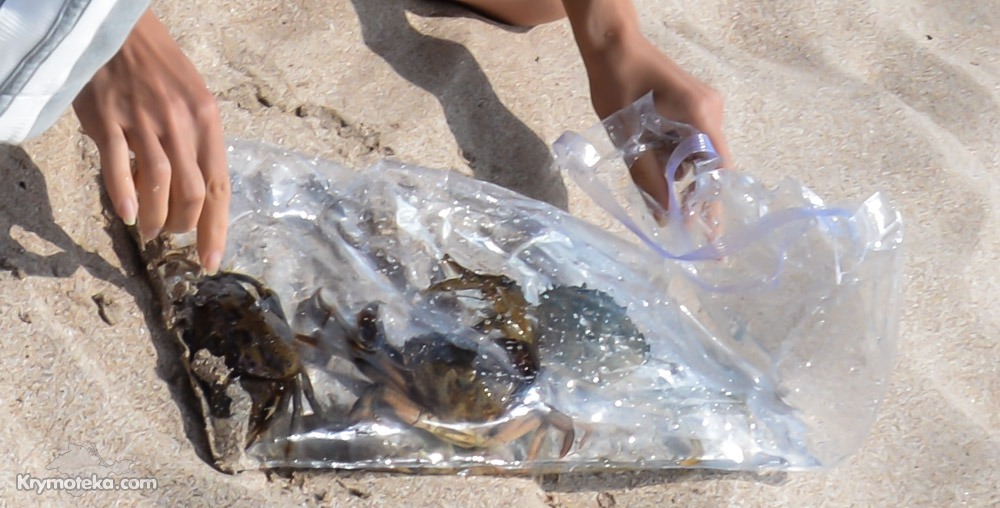 Кто-то на пляже хвастается своим будущим ужином — такие водятся на глубине, и палец им в клешню не клади!