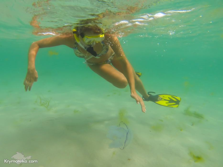 А вот и главное подводное приключение — синяя медуза-корнерот. На этом пляже радовало, что их немного и днем в чистой воде на светлом фоне дна их было хорошо видно, потому как они все-таки жалятся.