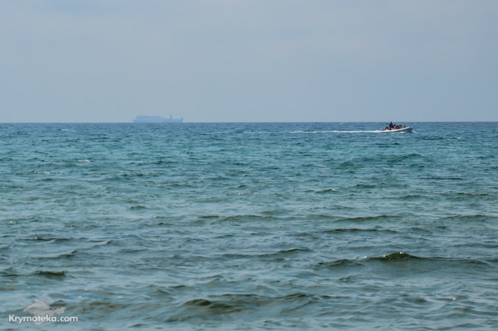 В дымке на горизонте можно разглядеть корабль-призрак. До сухогруза на горизонте 36 километров. Там пролегает морской путь из Одессы в Грузию. Снято на максимальном зуме ~10x