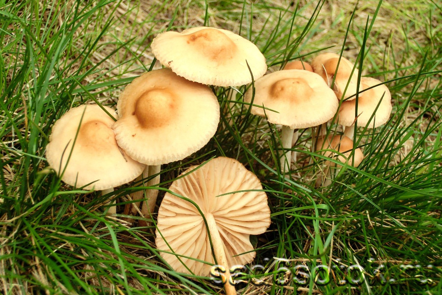 Стайки солнечных луговых опят появляются среди луговой травы, на опушках и вдоль лесных вырубок, начиная с мая, а уже к концу лета исчезают. Шляпка маленькая, диаметром около 3 см, с небольшим возвышением по центру, и кожицей бежево-оранжевого цвета. Ножка тонкая, высотой до 7 см. Пластинки кремовые, редкие, мякоть желтоватая, приятного сладковатого вкуса.