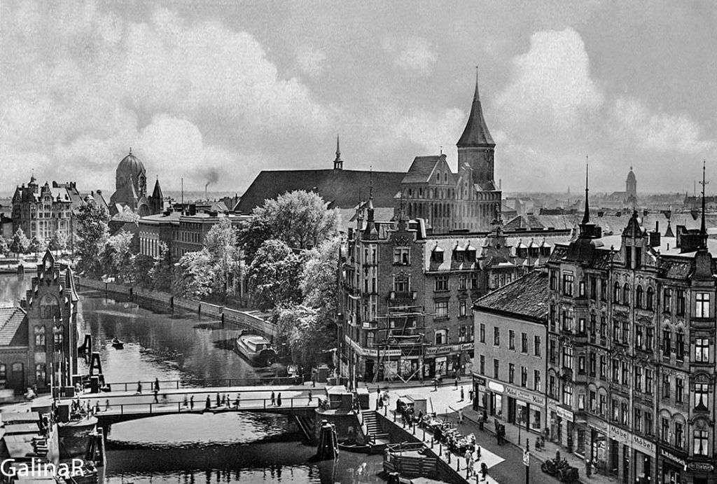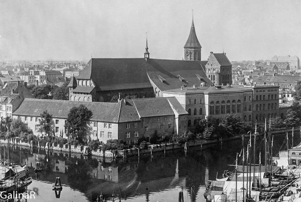 Вот так выглядел остров Кнайпхоф до войны. Видно, что собор окружают дома. На переднем плане старое здание университета.