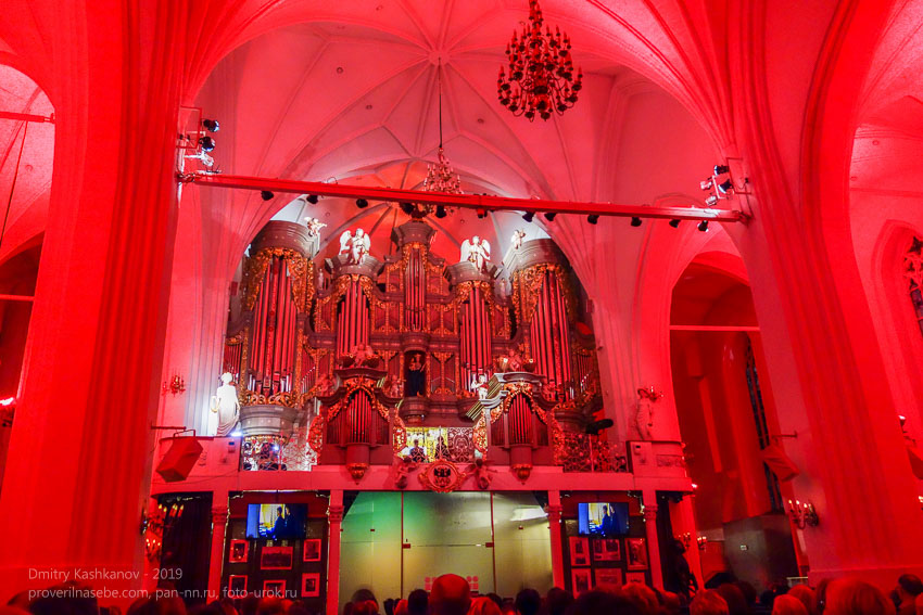 Зачем? Дело в том, что в зале две сцены. Одна впереди, там, где находится орган, другая позади. Там проходят обычные концерты. Соответственно, зрители в любом случае должны сидеть лицом к исполнителю. Но лавочки разворачивать не приходится. Достаточно просто наклонить их спинки в соответствующую сторону и можно с удобством располагаться. Очень интересное и умное решение. Наверное, немцы придумали.