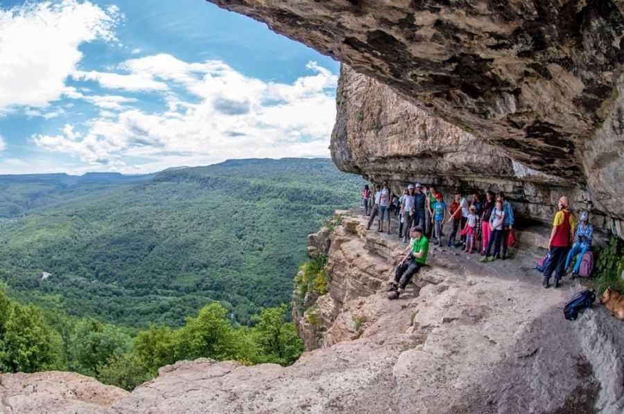 Над «Полочкой» — как ее ласково называют местные – нависает каменный козырек. Она расположена на высоте 1000 м над уровнем моря, и 300 м над Мезмаем, так что отсюда открывается великолепная панорама окрестностей. Полка называется Орлиной, так как над ней расположено гнездовье хищных бородачей и сипов – их несведущие в орнитологии посетители часто путают с орлами.