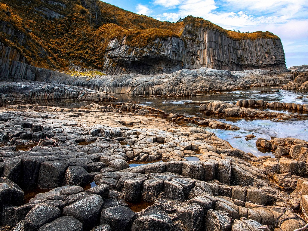 Мыс Столбчатый — уникальный объект: сложен природой из многочисленных базальтовых столбов, образовавшихся в результате извержения вулкана и медленного выдавливания лавы, которая затем застыла.
