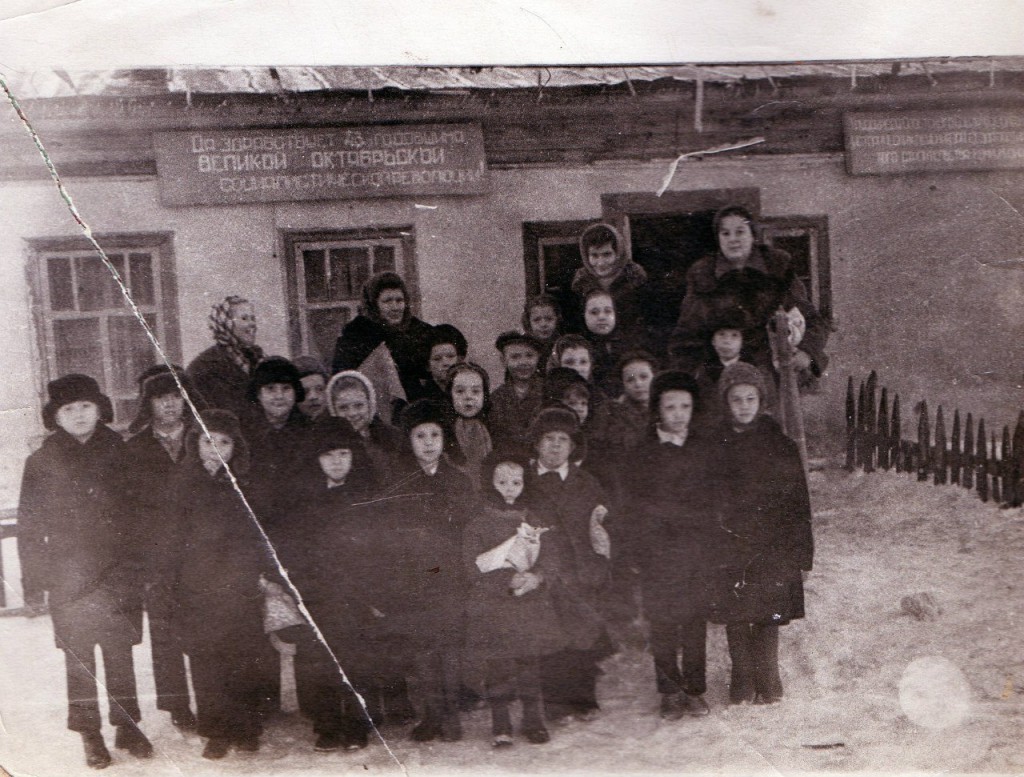 Школьники (среди них — мой папа) на фоне кильдинского клуба. Судя по тому, что празднуется 43 годовщина Великой Октябрьской Революции, 1960 год. За это редкое фото спасибо Нине Михайловне Коваленко (Чуниной).