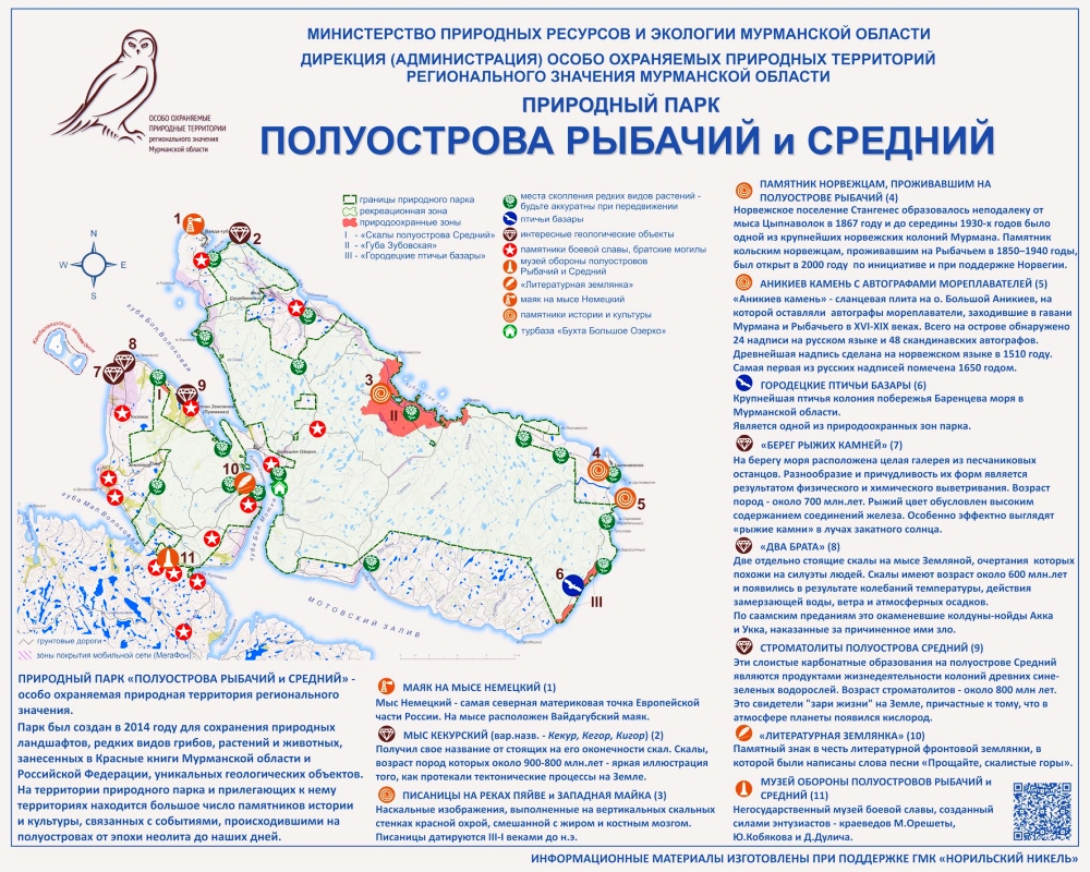 Аникеев остров – это уже не территория полуостровов Средний и Рыбачий. Но до него можно быстро доплыть на моторной лодке от берега Рыбачьего. Здесь есть на что посмотреть: главная достопримечательность – сланцевая плита, покрытая надписями-отметками норвежских и русских мореплавателей, самая ранняя из которых относится к началу XVI века. К сожалению, с каждым годом плиту перекрывают «автографы» современных туристов.