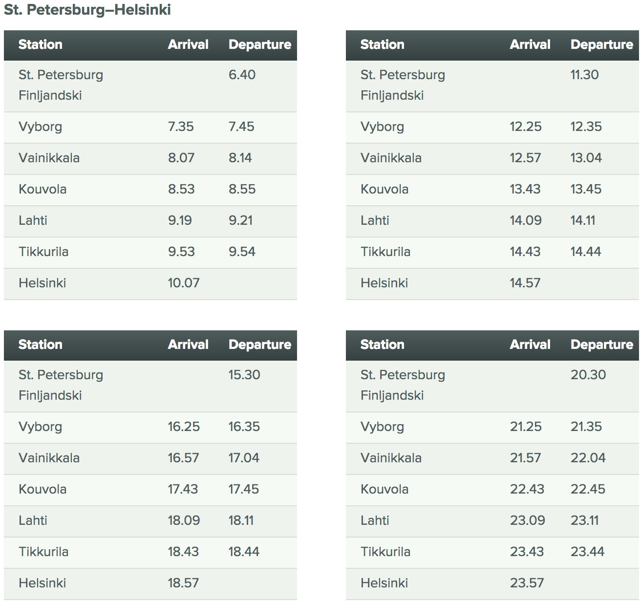 Из Санкт-Петербурга в Хельсинки каждый день до четырёх раз в сутки отправляется скоростной поезд «Аллегро». Также у жителей Северной столицы есть возможность сесть на фирменный поезд «Лев Толстой», который следует из Москвы и делает в Санкт-Петербурге остановку. Этот вариант дешевле, но дольше.
