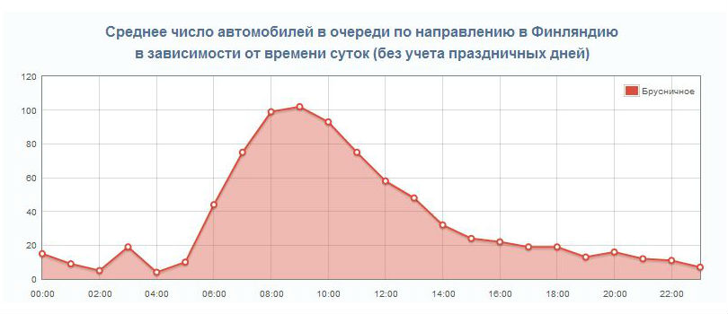 Рассчитывая время поездки, нужно учитывать, что пиковая нагрузка на пропускной пункт по направлению в Финляндию приходится на 6-12 часов утра. Пересекать границу в Брусничном на пути обратно в Россию стоит после 2 часов ночи и до 16 часов дня – в это время вероятность попасть в пробку минимальна.