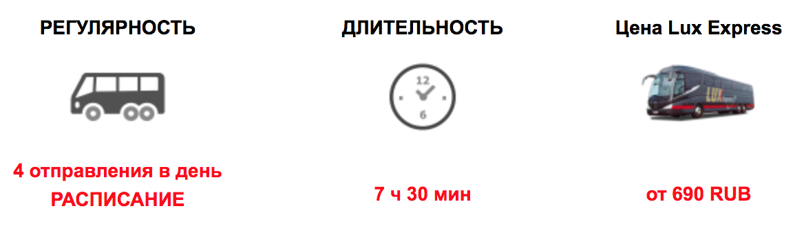 Одними из самых популярных перевозчиков считаются Lux Express, AMG Travel и СовАвто. Автобусы курсируют с 07:00 утра и до 23:00 ночи. Ночных рейсов на маршруте не предусмотрено. Билеты приобретайте на официальном сайте онлайн.