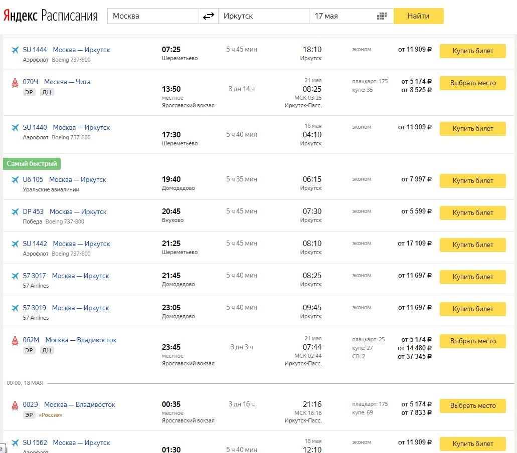 Автор пользуется сервисом Яндекс-расписание. Сервис прост, легко доступен и предлагает множество маршрутов транспорта. Рейсы из Москвы в Иркутск на самолете в зависимости от времени суток и авиакомпании стоят как плацкартные места в поезде.