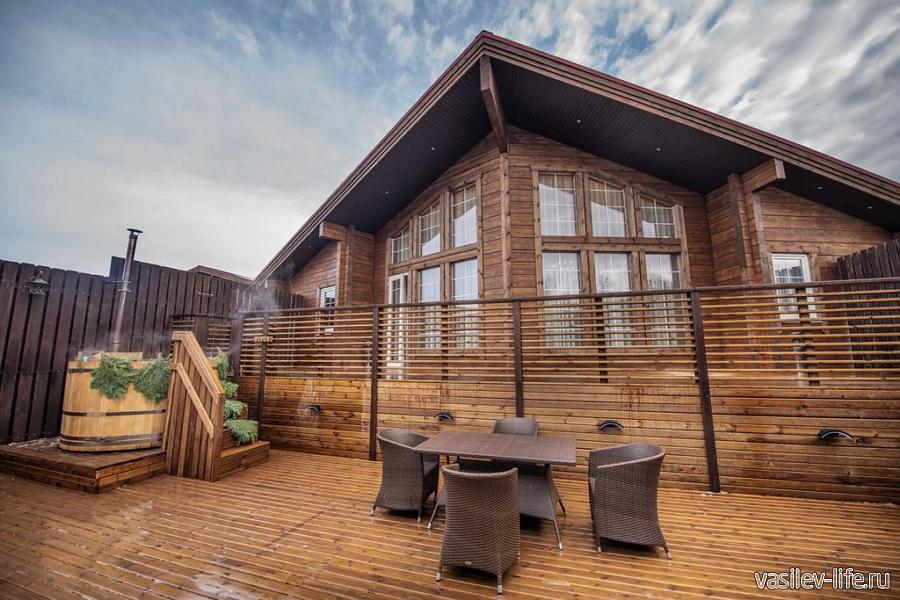 Комплекс отдыха предлагает проживание в комфортабельных деревянных домах, компаниям от 2 до 9 человек. На территории есть ресторан. В каждом доме оборудованная кухня. Утром, гостям сервируется завтрак. Снять дом на Новый год можно еще и со скидкой. На озере комплекса организована платная круглогодичная рыбалка.