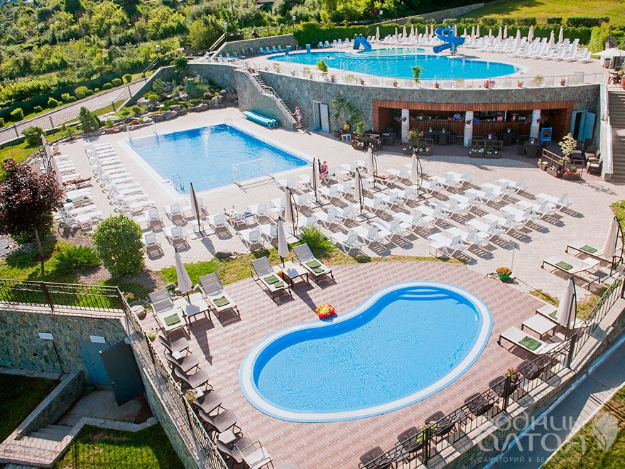 В санатории работает самый большой за Уралом комплекс открытых бассейнов. На территории есть две детские зоны, горки, водопады, гидромассаж и бар с прохладительными напитками. Открытые бассейны подогреваются.
