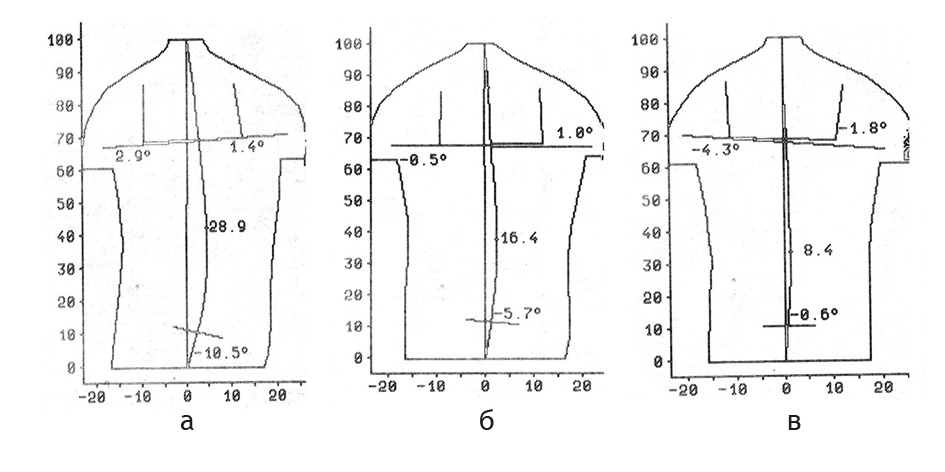 Перекос таза и отклонение позвоночника при разной длине ног 6 см. а — без компенсации; б — с компенсацией 3 см; с компенсацией 6 см.