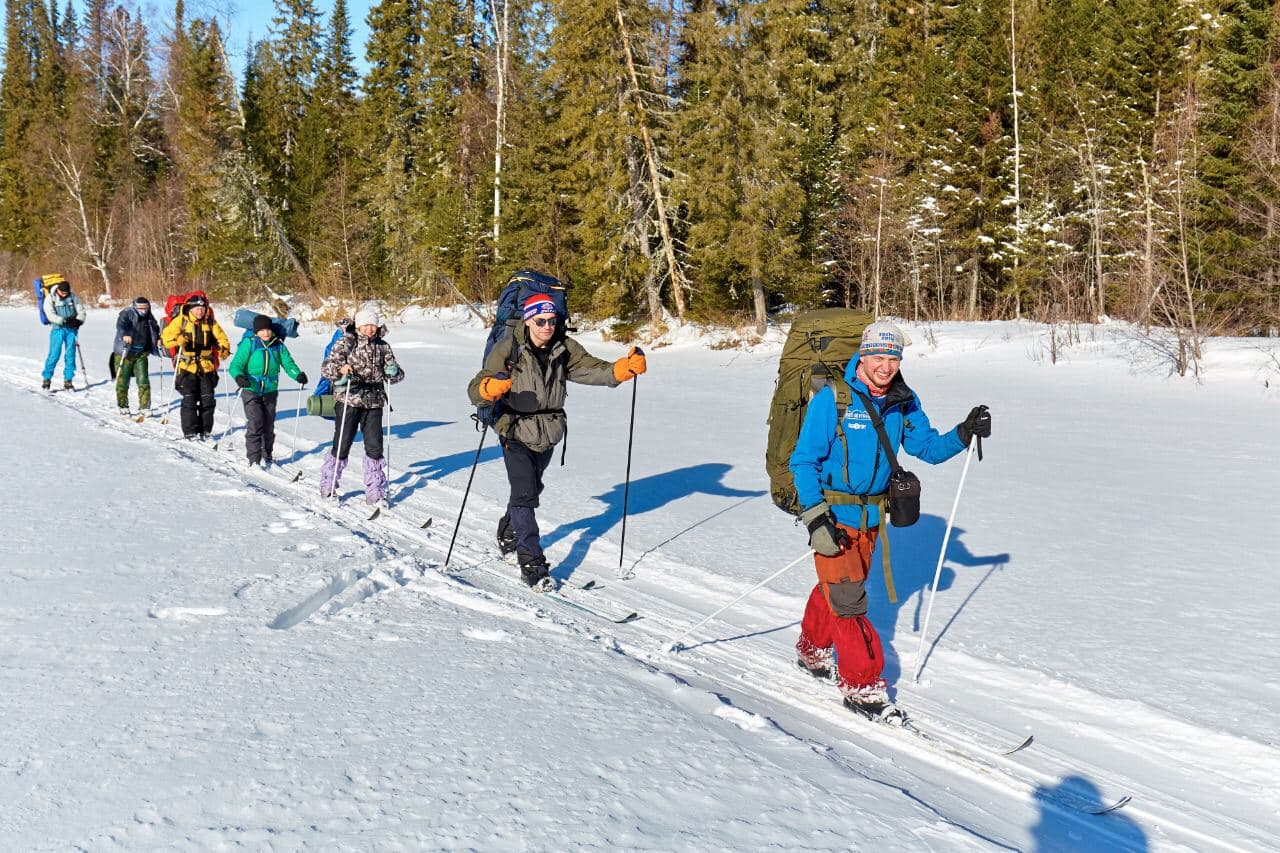 Из Екатеринбурга на поезде группа 12 часов едет до станции Ивдель-1. Здесь мы грузимся в «вахтовку» и 6-7 часов едем до деревни Ушма. От нее уже на лыжах выдвигаемся к реке Ауспия, где и ночуем. Цель второго дня – дойти до базы Ильича. Это бревенчатый домик, где пройдет вторая ночевка.