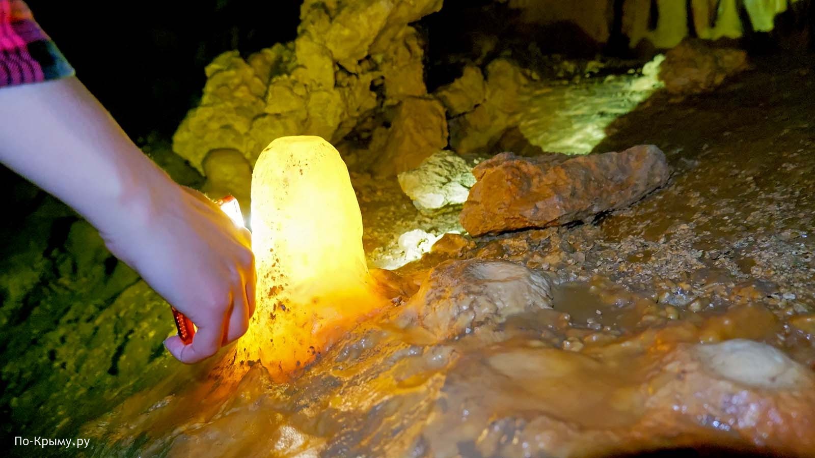 Экскурсовод обратит ваше внимание на кальцитовые “свечи”, просвечивающие на свету и нежные геликтитовые “цветы”