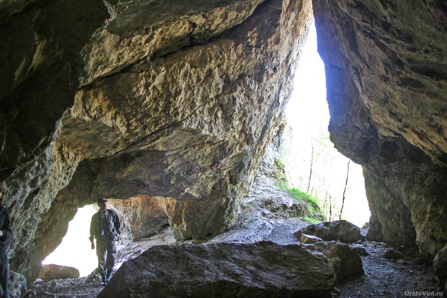 Внушительный вход в пещеру открывается в дугообразном скальном обнажении на высоте 11 м над урезом воды реки Сим. Пещера очень эффектно выглядит с другого берега реки. Подняться к ней можно по установленной тут металлической лестнице. Входное отверстие ориентировано на юго-восток. Его размер 12х12 м. От входа начинается обширный Входной грот шириной до 10 м, высотой 7,5 м и длиной 44 м. Он хорошо освещается солнечным светом и прекрасно прогревается.