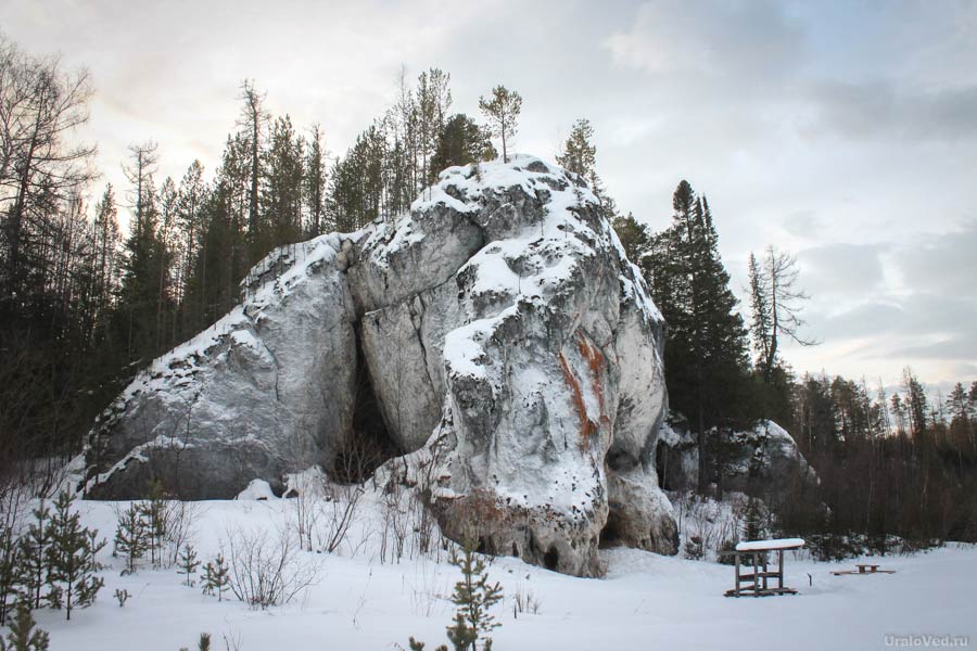 Скала стоит на правом берегу старого русла реки Сосьвы, ложе которой можно заметить, если присмотреться к рельефу. Раньше ее омывали воды реки.