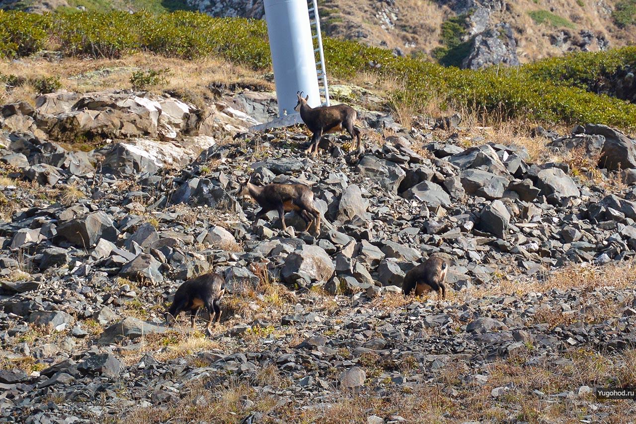 В начале пути — самая сложная часть маршрута. Нужно преодолеть Цирк-3 и выйти на перевал “Горки город”. Для подъема из цирка мы выбрали тропу под неработающей канаткой, по пути встречаем группу кавказских серн, которые охотно позируют для фото.