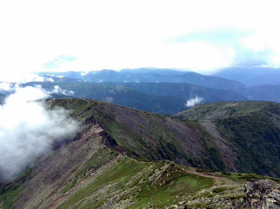 От метеостанции начинается серпантин, преодолев который мы выходим на гребень хребта. Уже отсюда открывается впечатляющий вид на расположенные рядом горные вершины. Теперь мы видим нашу цель — пик Черского, высота которого чуть более 2000 м (2090). Впечатляет и радует взор удивительное озеро Сердце, притаившееся среди горных исполинов.