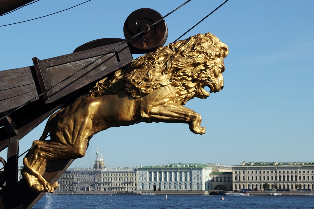 Монумент льва можно лицезреть на довольно известном корабле «Летучий Голландец», который будет ждать вас, пришвартованным на Мытинской набережной.