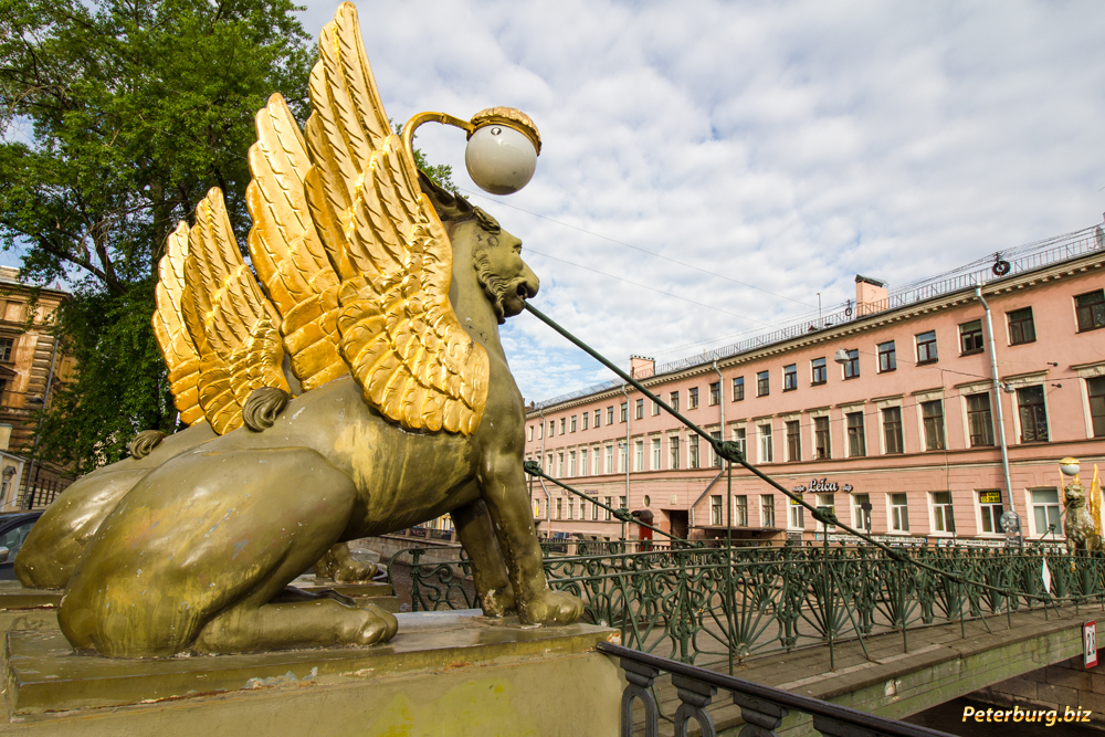 Самые популярные, самые фотогеничные и самые любимые львы Санкт-Петербурга «живут» на набережных Невы и мостах через Канал Грибоедова. Через последний перекинулось целых 2 моста, являющихся символами и открыточными видами города – Львиный и Банковский мост. На Львином мосту сидят очень симпатичные львы с роскошными гривами. А вот Банковский мост украшают златокрылые грифоны. Оба моста не только очень красивые, но и ценные с исторической точки зрения – они относятся к цепным мостам, которых в Петербурге осталось всего три.