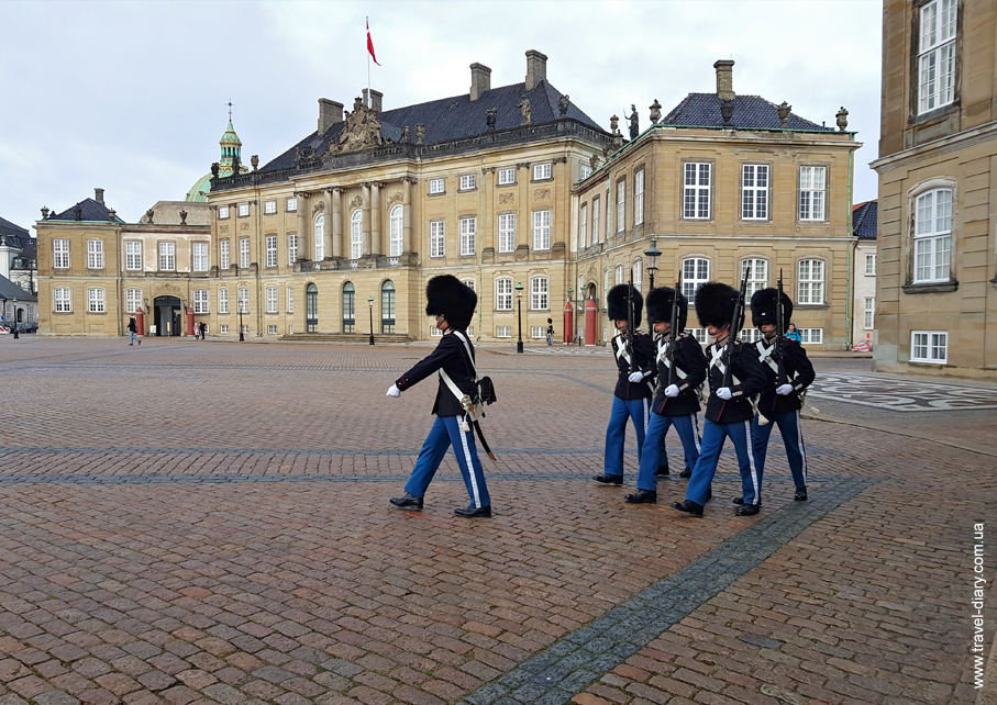 В один из дней мы посетили королевский дворец Амалиенборг. По сей день, он является резиденцией королевской семьи. Каждый день, на площади возле дворца проходит смена почетного караула. Действие очень увлекательное и интересное. Мужчины в черных кителях и синих брюках с белыми лампасами и высоченными мохнатыми шапками с медвежьей шерсти маршируют по дворцовой площади, сменяя друг друга. А неподалеку в морской пучине скромно сидит русалочка, знаменитого сказочника Ганса Кристиана Андерсена. Памятник милой девушке, сидящей на камнях, является символом Копенгагена. А ее творец заслужил почет и славу жителей столицы. В Копенгагене на площади Нюхавн есть дом Андерсена, а на городской площади, возле ратуши открыт музей, посвященный писателю. Его портрет красуется даже на самолетах датских авиалиний.