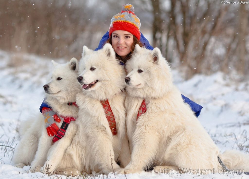 - Догтреккинг (прогулка с собаками ). Обычно это 3 самоеда (Тедди, Миша, Кузя) + один хаски (Скай).