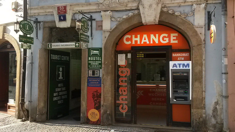 В туристических кварталах Праги обменники встречаются буквально на каждом шагу. Особенно много их в районе Староместской и Вацлавской площадей, Карлова моста, Гавельского рынка. Такие заведения можно узнать по надписи «Change» (хитрые маркетологи еще добавляют пометку 0 %, видимо, для увеличения потока клиентов, но иногда действительно везет и дополнительный процент там не берут).