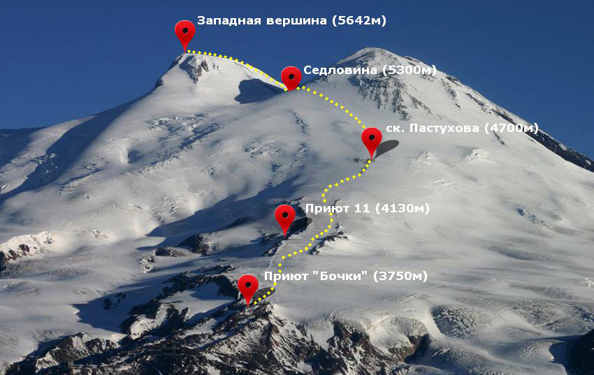 Является наиболее популярным. Сложность маршрута по российской классификации 2A (II по классификатору УИАА). Маршрут начинается (как правило) от приюта «Бочки» (конец канатной дороги, 3900 м), и идёт практически диаметрально вверх под Восточную вершину мимо бывшего Приюта одиннадцати (4157 м), нового приюта и скал Пастухова (4670 м) до высоты примерно 5000 метров, откуда по так называемой косой полке осуществляется выход на седловину (5416 м). Далее от седловины очевидный подъем на любую из вершин. Как правило, продолжительность восхождения с учетом транспортных издержек, акклиматизационных выходов, погоды и степени готовности восходителей занимает 8—10 дней (непосредственно путь от Приюта 11 до вершины для подготовленных спортсменов занимает 5—6 часов (без учета времени на спуск).