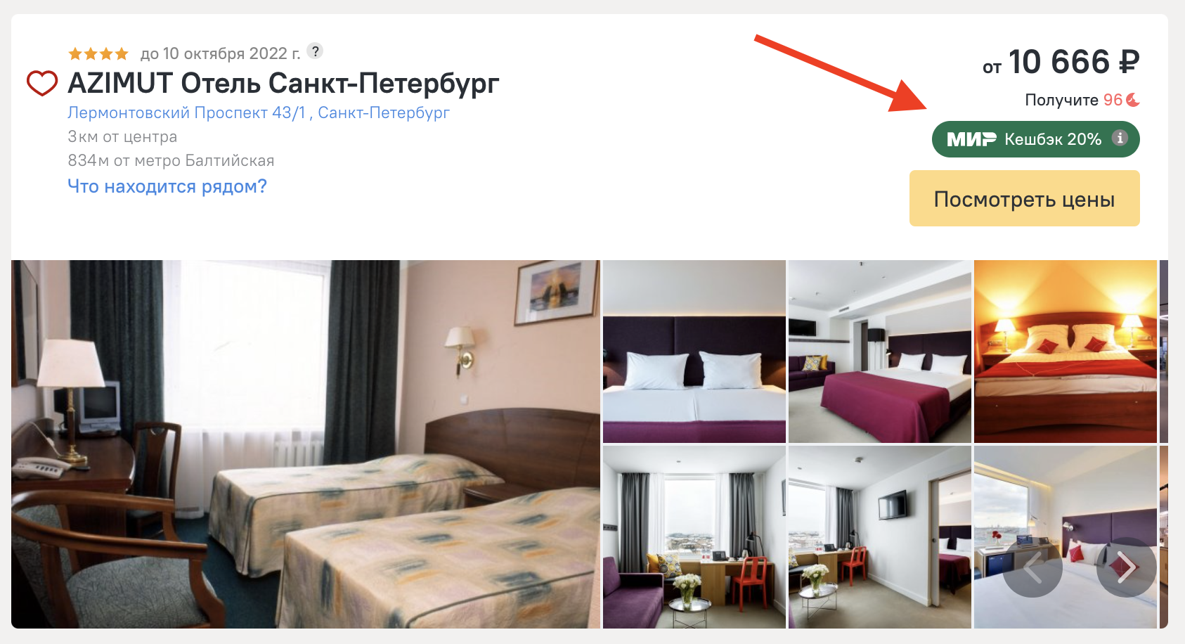 - Дальше нужно перейти на сайт партнера программы — туроператора, отеля или агрегатора, — выбрать интересующее предложение и убедиться, что оно акционное. Такие путевки отмечают специальным значком «Мир» или «Кэшбэк» или размещают на отдельной странице.