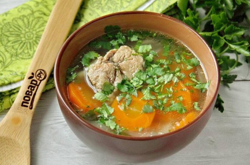 Миун-мясо, приготовленное на кости на открытом огне до мягкости и нежности, подается в бульоне с морковью и луком