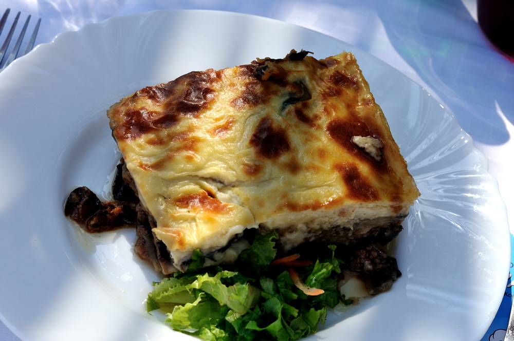 В Греции мы впервые попробовали мусаку. Для меня это блюдо стало открытием сезона и полным откровением. Слой баклажанов порезанных кольцами с кожурой, мясной фарш, помидоры, слой картошки и сверху все это обильно полито соусом бешамель на основе местного сыра. Мы ели ее почти каждый день, это блюдо-праздник, особенно хорошо под местное розовое вино. Цена доступная: от 3 до 7 евро за порцию. Чем дороже мусака, тем меньше в ней картофеля и больше мясного фарша и баклажана.