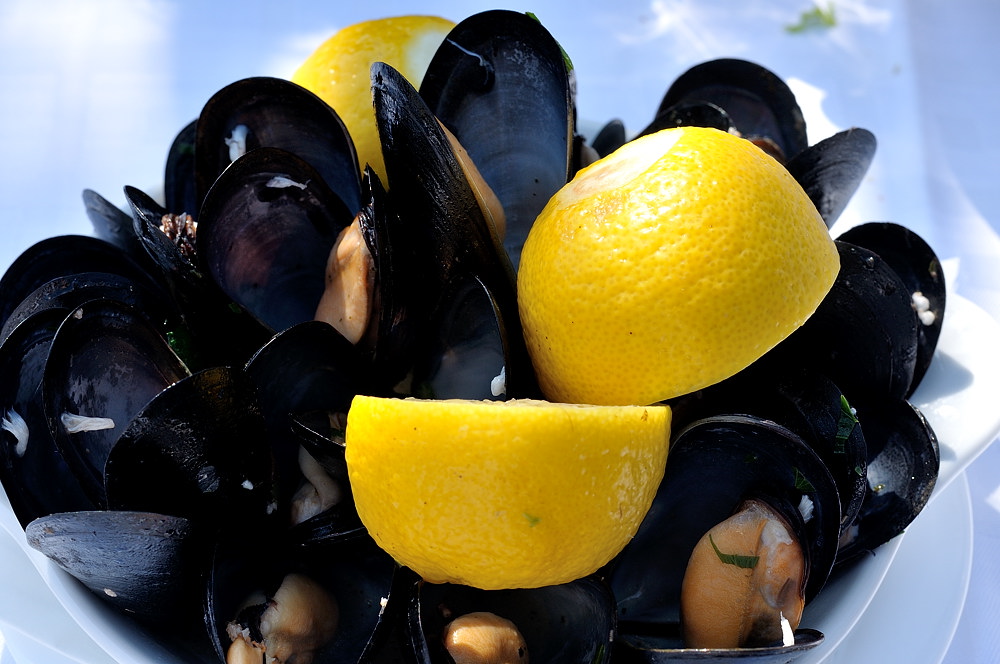 Еще здесь вкуснейшие мидии, Таня после бельгийских мидий за этих молюсков «родину продаст». Греческие мидии еще вкуснее бельгийских и ни в какое сравнение не идут с замороженными. Наливаем бокальчик белого и приступаем. Очень вкусные мидии в кляре, но больше всего понравились отварные мидии в раковине. Очень нежное мясо с привкусом сливок, морской соли и лимона. Кстати свеже выловленные черноморские мидии, приготовленные на гриле ничуть не хуже. вареные мидии в раковине 🙂