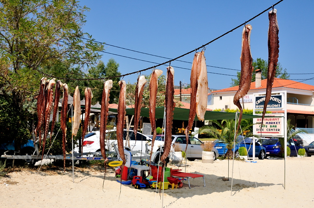 Еще один типично греческий деликатес – осьминог. Эти морские твари сушатся на веревочке, как белье в одесском дворике, практически возле каждого уважающего себя ресторана или таверны у моря. Не попробовать осьминога в Греции равносильно отказу попробовать пиво, будучи в Праге. Осьминогов нарезают кусочками, только щупальца – голову не едят, затем жарят на гриле и подают вот примерно в таком виде, опять же оливковое масло обязательно и лимончика немного.